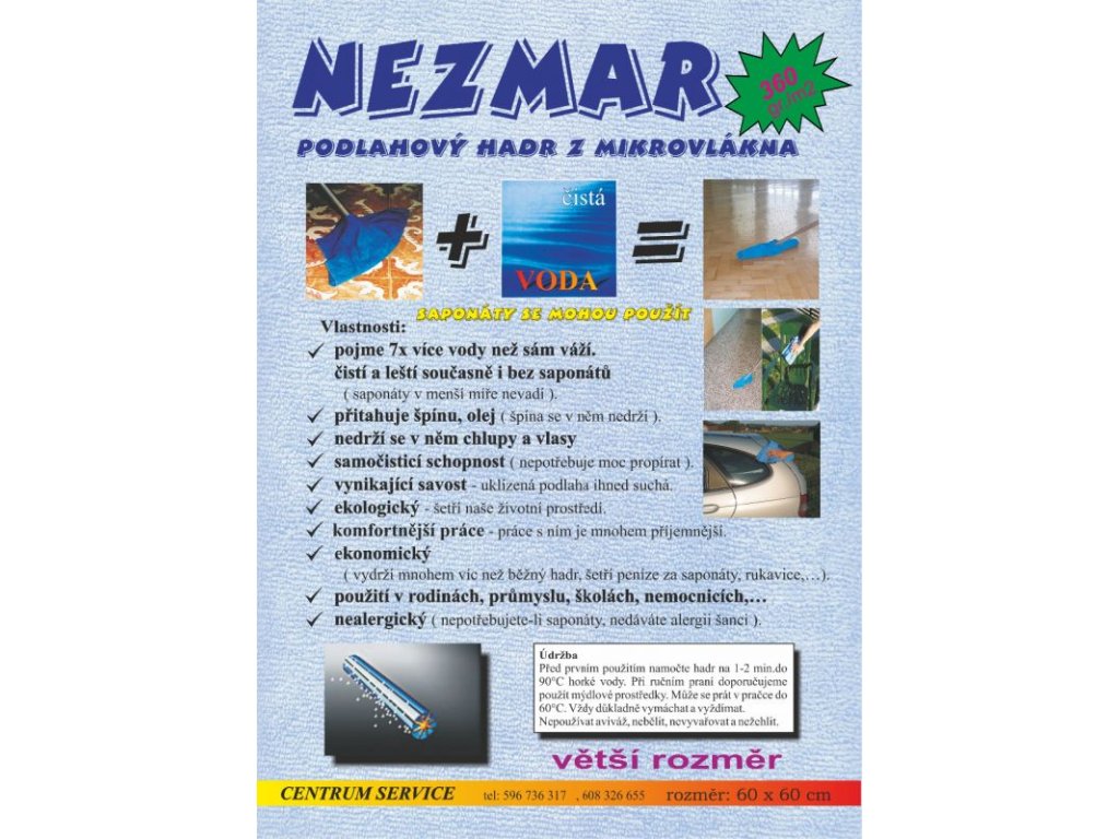 Podlahový hadr "Nezmar" Centrum Service z mikrovlákna vysoké hustoty a pevnosti ve velkých zařízeních vydrží i celý rok stálého vytírání. Vyznačuje se velkou savostí a snadnou ždímatelností.